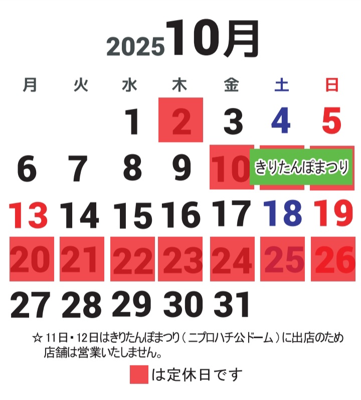 今月はきりたんぽまつり出店の他、内装工事のためのお休みをいただきます。